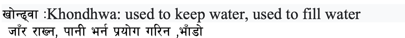 Khondhwa is a traditional vessel used by Tharu families for carrying and storing drinking water. Designed to be lightweight and easy to handle, it plays a central role in daily domestic routines.